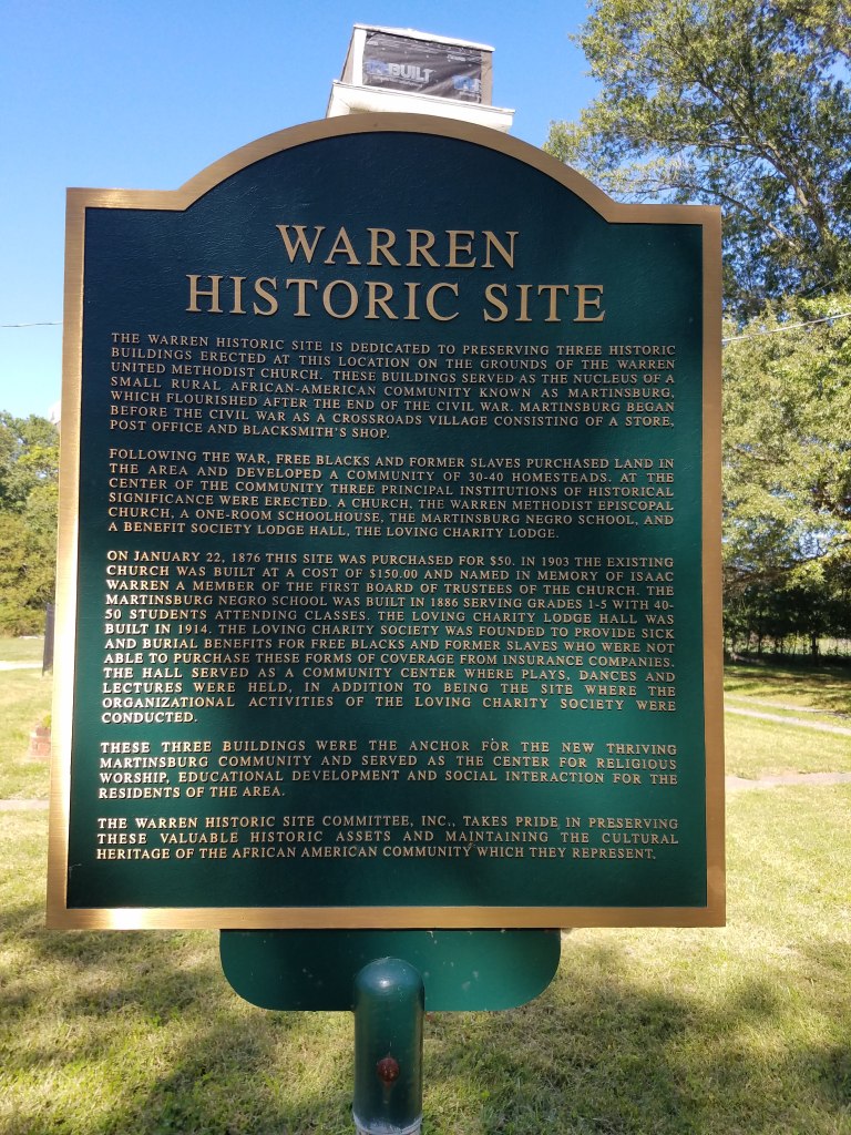 The Warren Historic Site is a designated historic district comprising of three key structures, the Warren UM Church (built in 1903), the one-room Martinsburg Negro School (built in1886), and the Loving Charity Lodge Hall (built in 1914). These buildings comprise what was the nucleus for most African American communities founded in Maryland following the end of the Civil War through the beginning of the twentieth century. The Warren Site is the last in Maryland to retain all three structures. While the church and school continue to be used, the Loving Charity Hall is in a dilapidated condition and is currently on Maryland’s list of Endangered Sites. As Montgomery County grows, the demands on housing dictate replacing farms and historic structures with new housing and so we are losing what remains of the historic landscape. The Warren Historic Site Committee has worked to save this last vestige of a dying community that speaks to the resilience and determination of a people who, having started with nothing, managed to create a once thriving community.