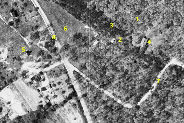 Hall entrance road; 8, Gunston Road. (Base photo is a detail from a U.S. Soil Conservation