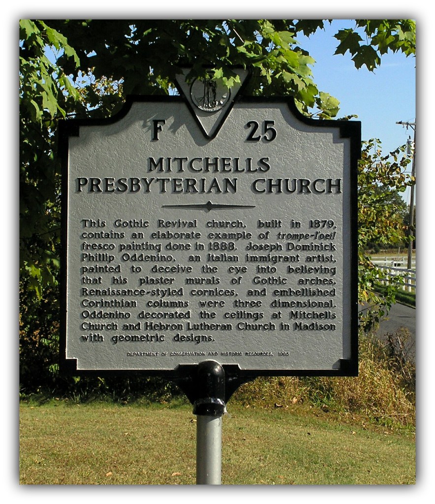 STATEMENT OF SIGNIFICANCE: The simple, Carpenter Gothic Mitchells Presbyterian Church at Mitchells, Culpeper County, contains the most elaborate example of the late 19th-century, folk-styles trompe l’oeil frescoes in the Commonwealth. Executed 1892-99 by the Italian immigrant painter, Joseph Dominick Oddenino, the artwork is a curious transplant in the rural Virginia countryside of the ancient art of fresco common throughout Europe. Oddenino’s lively but naive architecture schemes, incorporating Gothic and Renaissance motifs, are suggestive of civic and religious fresco painting practiced for centuries in his native Italy. The church is one of several examples of the painter’s work that include fragments at the Hebron Lutheran Church in Madison County and the Culpeper County Courthouse.