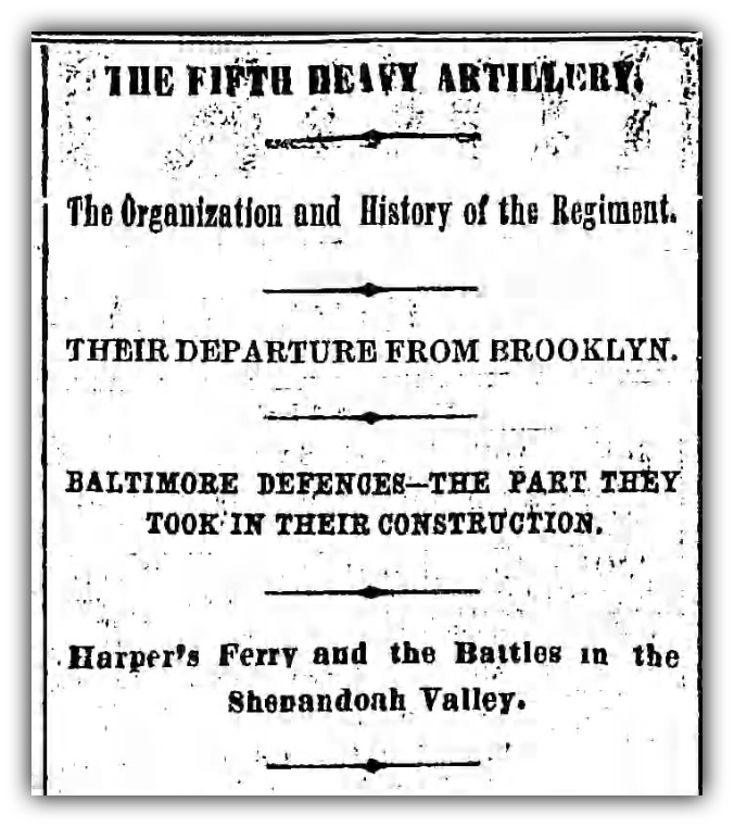 The Fifth Regiment of Heavy Artillery was organized in this city by Samuel Graham on the 9th day of March, of 1862, and was originally intended to garrison the forts of New York harbor, so as to relieve a large number of Regulars and Volunteers which were detained here, and which was designed to send to the front, where their services were more urgently required. It was believed that the new regiment would soon be so drilled as to be equal behind forts and earthworks to soldiers of larger experience. About this time there was some uneasiness regarding the rebel privateers, which made sad havoc with our commerce, and who became so bold and confident that they threatened New York with demonstration. There was a feverish feeling thereto, and it was predicted by tried friends of the Republic as well as open foes that the rebel iron clads could easily pass the forts and lay New York under tribute. The Navy Department becoming more active, the necessity of the Fifth Artillery in our defenses became less urgent, and by the time it was raised the authorities were amply prepared to give any intruding vessels a very more reception, and the regiment was ordered to Baltimore, which was still with the South in sentiment and feeling.