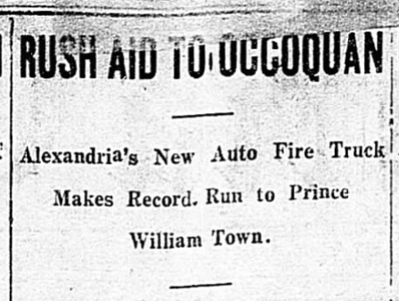 Making a record run to historic Occoquan, 17 miles south of this city, at the head of Occoquan Bay, Alexandria’s new chemical automobile fire engine stayed the progress of the huge conflagration which raged in the little Virginia village yesterday afternoon and saved it from entire destruction. Wires were kept hot yesterday afternoon from Occoquan to Washington and this city asking for help in controlling the fire, and the Alexandria engine was the only one to answer the call.