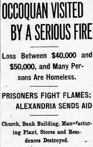 OCCOQUAN, Va., August 26. – Between forty and fifty residents of Occoquan last night slept in the homes of friends or in the Odd Fellows’ Hall here as the result of a disastrous fire which swept away their homes and other property in the afternoon. The loss is between $40,000 and $50,000.