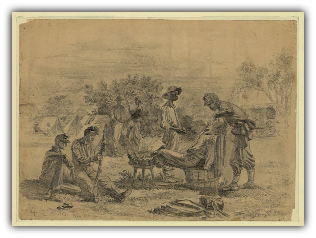 Then in an instant all Was Wild confusion as a calvary Man dashed into the Dining Room and Said “The Yankees is in Falmouth.” Every body was on their feet at once, No-body finished but Some ran to their rooms to get a few things, Officers and Soilders hurried to their Quarters Every Where Was hurried Words and hasty foot Steps.
