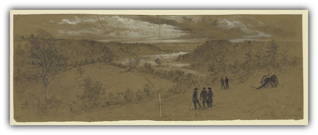 We left the road just before we got to “Ficklin’s Mill,” and walked down to the river. The long line of Sentinels on the other Side doing duty colose to the Waters Edge.