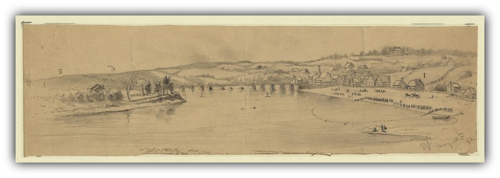 John Washington was born into slavery on May 20, 1838, in Fredericksburg, Virginia. His mother was Sarah Tucker, an enslaved woman, and his father was a white man. His mother, Sarah, was rebellious and tried to escape several times during his childhood. The first time, she was punished by being hired out for a time as a field hand. Despite the hardships, she took the time to teach him to read and write. After the end of the war, Washington penned one of the few escaped slave narratives, Memorys [sic] of the Past, in 1873. The narrative below from Washington’s Memorys, his passage across the Rappahannock to freedom in April 1862, encapsulates the high point of his life, a slave no more. Washington crossed just hours after the arrival of the Union army at Falmouth; indeed, he may have been the first to do so, the first of more than 10,000 – 12,00 more to follow.